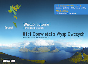 Głównym punktem programu będzie spotkanie z Marcinem Michalskim i Maćkiem Wasilewskim, autorami książki "81:1 Opowieści z Wysp Owczych". Goście przybliżą atmosferę archipelagu, opowiedzą o swoich przygodach i oryginalnych obserwacjach farerskiego społeczeństwa. Po zakończeniu wieczoru autorskiego chętni mogą wziąć udział w nieoficjalnej części spotkania, połączonej z degustacją piwa Okkara Pilsnari.