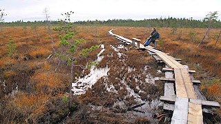 Najsłynniejszy teren pieszych wędrówek w fińskiej Laponii to rozciągający się na obszarze ponad 250 tys. hektarów Park Narodowy im. Urho Kekkonena. Nie trzeba jednak jechać aż do Saariselkä. Nawet w okolicach Rovaniemi, można znaleźć mnóstwo interesujących tras, na przykład pomiędzy wioskami Viittaköngäs i Vaattunkikögäs, wzdłuż linii kręgu polarnego, rozciąga się znakomicie oznakowany teren dla pieszych wędrówek. Można tu, jak na dalekiej północy, wędrować nocując po drodze w szałasach, ale są tu również bardzo ciekawe szlaki jednodniowe. Na tablicach informacyjnych znajdziemy szczegóły dotyczące długość tras, stopnia trudności i oznaczeń. Są nawet nieco krótsze trasy dostępne dla osób niepełnosprawnych. Szlak może prowadzić przez las porastający granitowe wzgórza, wzdłuż strumieni i bystrzy, na których latem uprawia się rafting, i które miłośnicy wędkowania szczególnie sobie cenią. Prowadzą też przez podmokłe tereny obfitujące w wyzbierane już o tej porze jagody moroszki (lakki). Kładki wyznaczające szlak bywają bardzo śliskie. Na tych odcinkach kijki do nordic walkingu zupełnie się nie przydają. Grzęzną głęboko w podmokłym mchu, ześlizgują z wąskich kładek. Są za to nieocenione w lesie, gdzie idzie się ścieżką usłaną w poprzek różnej grubości i kształtu korzeniami drzew.