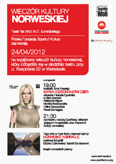 24 kwietnia w Teatrze na Woli odbędzie się wieczór kultury norweskiej. Jego główną atrakcją będzie inscenizacja dzieł Jona Fossesa pt. "Letni dzień" oraz "Matka i dziecko". Po spektaklu odbędzie się spotkanie z jego reżyserką - Izabelą Cywińską - oraz aktorami.