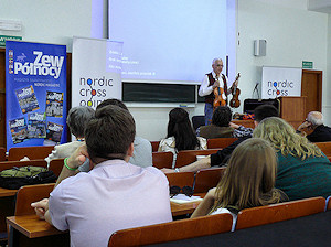 Kolejnym punktem była projekcja filmu "Hardingfele", poświęconego hardangerkom - unikalnym skrzypcom o czterech strunach głównych i czterech rezonujących. Opanowanie tego instrumentu jest wyzwaniem nawet dla wirtuozów klasycznych skrzypiec. Technika gry jest na tyle skomplikowana, że wielu z nich nie radzi sobie z hardangerkami. Film komentował pracownik naukowy Katedry Etnologii i Antropologii Kulturowej dr Piotr Klafkowski. To bodaj jedyny polski naukowiec, który posiadł tak szeroką wiedzę o norweskich skrzypcach, ludowych wirtuozach i całej kulturze towarzyszącej hardingfele. Na pewno zaś dr Klafkowski jest posiadaczem jedynych hardangerek w Polsce, o których barwnie opowiadał w swojej prezentacji. A zakończył ją? minikoncertem, złożonym z tradycyjnych norweskich utworów grywanych na hardangerkach. Dr Piotr Klafkowski zauroczył gości nie tylko wyjątkowym brzmieniem tego instrumentu, ale i fascynującą melodyką często anonimowych ludowych kompozycji.