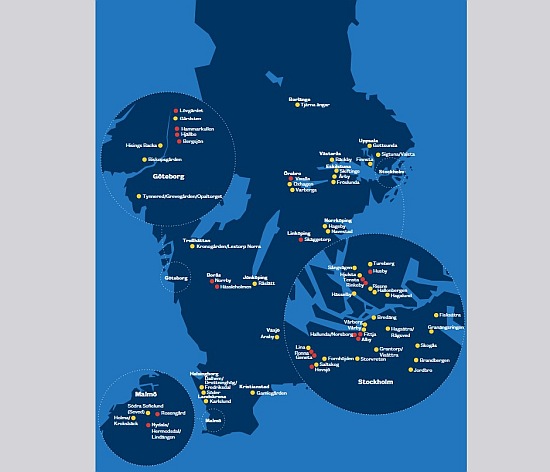 Do najbardziej zagrożonych zaliczono 19 obszarów (szwedzkie określenie: „särskilt utsatta områden”): Alby, Fittja. Hallunda, Norsborg w gminie Botkyrka pod Sztokholmem, Husby, Rinkeby i Tensta w Sztokholmie, kilka dzielnic w Södertälje (Ronna, Geneta, Hovsjö), Vivallę w Örebro, Bergsjön, Hjällbo, Lövgärdet i Hammarkullen w Göteborgu oraz Rosengård, Nydala, Hermodsdal i Lindängen w Malmö.